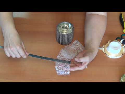 Вам понадобится: жестяная банка, двухниточная тесьма, тесьма с розами, атласные ленты, канцелярские булавки, клеевой пистолет, ножницы.